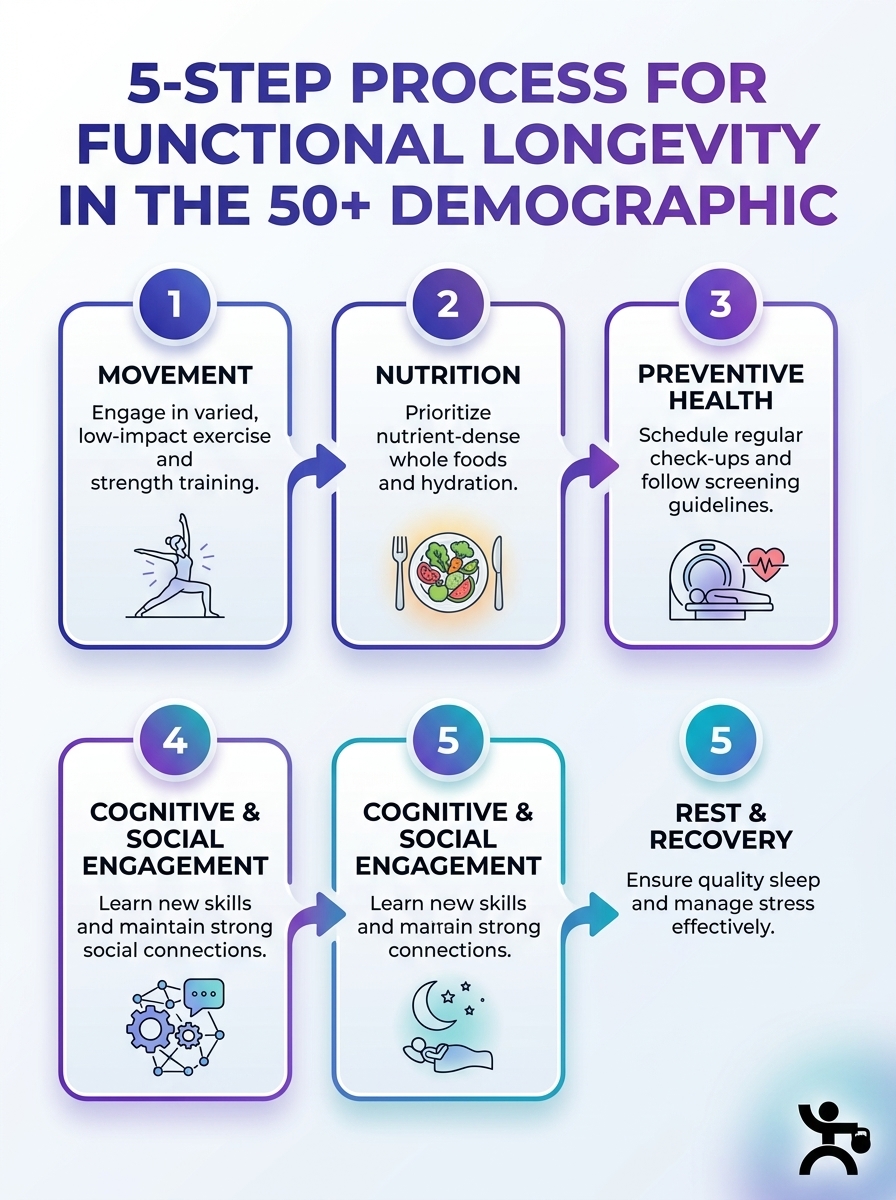 5-step infographic on Functional Longevity for the 50+ Demographic: activity, nutrition, sleep, health checks, resilience.
